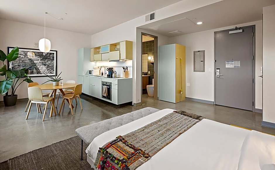 Relax, refresh, and recharge in an ultra-modern premium studio apartment with a fully equipped contemporary kitchen, washer and dryer, and a furnished balcony providing picturesque views of the breathtaking Nashville cityscape.